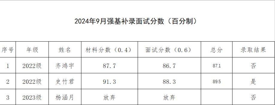 依据《网络博彩平台 强基计划本科阶段动态调整实施办法 修改版第3版》中有关补录的相关规定,在线赌博平台 于9月13日完成了补录材料审核及面试工作。经学生自愿报名,工作小组审核材料,面试小组对申请学生进行面试,最终面试成绩及录取结果如下: