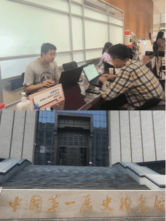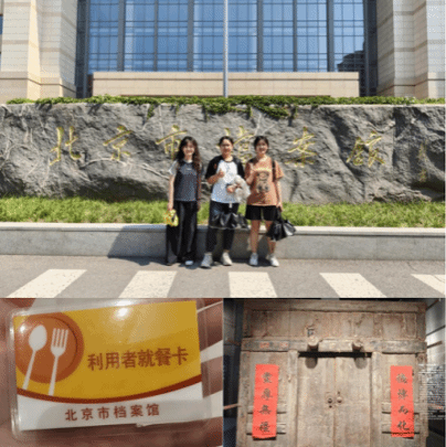 第六小组学生在实习首日于图书馆研修间召开行前讨论会,明确了报告大纲、实习地点、时间安排、交通方式等具体事项。实习第二天,小组成员按照拟定的计划前往北京市档案馆查阅资料,并参观了“档案见证北京”展览。一方面,通过查档案,小组成员摘录了《谭伊孝关于〈对东城南锣鼓巷的保护与利用的几点构想〉的来信及文物局王金鲁的意见》等与选题密切相关的一手史料;另一方面,在参观过程中,小组成员不仅看到了展馆中的方砖厂胡同的大门,还注意到了档案馆对北京胡同老字号的重视,这也给小组的实习项目带来了诸多启发,小组成员计划后续前往南锣鼓巷地区时着重对上述内容进行考察。