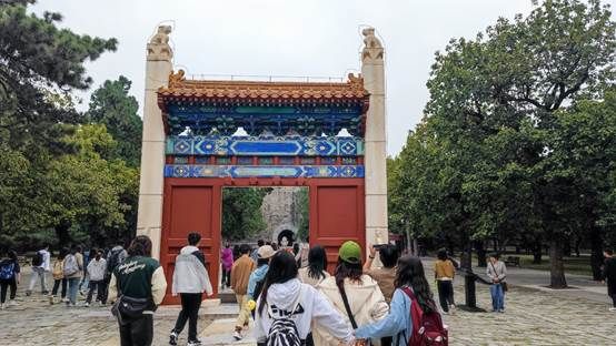 午饭休息过后,同学们来到了参观考察的第三站昭陵。昭陵是明朝第十二位皇帝朱载垕及其三位皇后的合葬陵寝。昭陵在历史上屡遭破坏,1987年开始修复,是明十三陵中第一座大规模复原修葺的陵寝。如今,明楼、祾恩殿、祾恩门、神功圣德碑亭等地面建筑气势恢宏,远处崇山映衬、松柏参天,风景美不胜收。