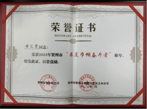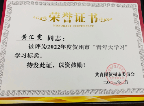 第39届团委副书记,2020年考取广西定向选调生,分配至广西壮族自治区贺州市委办公室。2021年4月至今担任贺州市委办公室派驻昭平县昭平镇江口村驻村工作队员、村主任助理。驻村期间,黄汇雯积极参与乡村振兴的各项工作,走遍全村1000多家农户开展工作,第一时间答复村民困惑,解决群众难题,在完善乡村基础设施、推进村集体经济发展、提升村屯乡村风貌等工作中提交了令人满意的答卷,其工作事迹先后被昭平先锋、贺州先锋等公众号报道。工作之余,黄汇雯仍不忘继续学习充实自我,2022年被评为贺州市“青年大学习’学习标兵,2023年获得了“贺州市最美巾帼奋斗者”的荣誉称号。