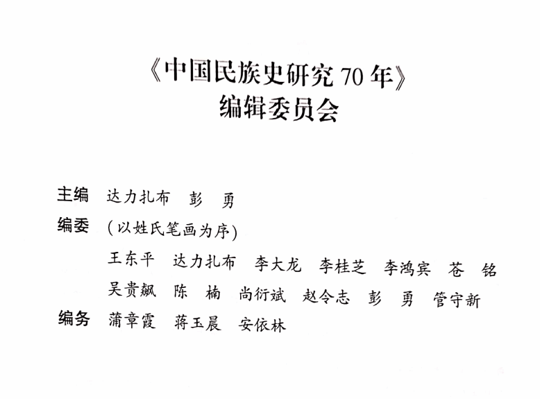 组织编写、达力扎布和彭勇担任主编的《中国民族史研究70年》一书正式出版发行。作为中央民族大学出版社组织申请的国家社科基金出版项目“中国民族学科70”丛书正式出版之一种,该书全景式地展示了新中国成立70年间在中国民族史研究各领域所取得的丰硕成果。