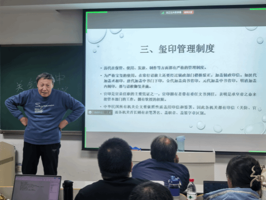 接着,柏桦教授深入讲解了玺印制度。柏桦教授指出,古人对印的崇拜,即对官职的崇拜。在古代,无论是君主的诏敕,还是各级官府之间使用的各种公文书,都必须加盖玺印作为凭信。玺印是权力的象征,也是权力的表现形式之一。历代在保管、使用、发放、制作等方面都有严格的管理制度。皇帝的御玺铭文不同,其用途也不同,进而将不同的诏敕区别开来,以保证诏敕内容的严谨。为严格宝玺的使用,在常行诏敕上还要经过辅政部门稽核驳正,加盖辅政印信。如汉代加盖丞相印,唐代加盖中书门下印,金代加盖尚书省印,元代加盖中书省印,明清加盖内阁印,都与诏敕御玺并施。官员印信则必须按照官品、官衔以区别官印的型质、轻重、大小和文字,借以区分官员地位和职权范围。玺印制度的完善,不但使官员任免有了严格的手续,也加强了文书工作的严谨性,更重要的是确立了权力体系。关于鉴别文书真伪,柏桦教授称:印在签字之上,则为假。
