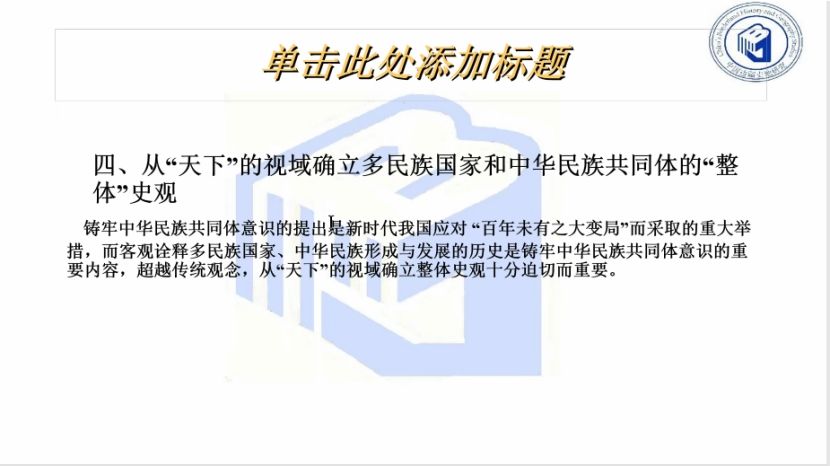 李大龙研究员讲授道,我们要铸牢中华民族共同体意识,客观诠释多民族国家、中华民族形成与发展的历史。“中国”并非专指王朝的疆域,其适用的场景是中华大地上众多的政权对“正统”乃至“大一统”的博弈,将其引入“历代国土范围”“历史上的中国”的讨论,和其性质并非完全吻合,不仅无助于讨论的深入反而极容易将讨论引入到“以谁代表中国”的误区,历代王朝和非历代王朝都是多民族国家中国历史的组成部分,是共同缔造,不存在谁加入谁的问题。李老师以水系比喻,为我们讲述了历代王朝(中国)是干流(黄河),边疆(非中国)是支流(非黄河),同属“中国(多民族国家)”(黄河水系)。全面书写才能完整客观。《中华民族共同体概论》的处理方式,主要体现在几个方面:一是以整体的视角,用中华文明统领整个叙述。二是虽然以历代王初存在的时间作为划分每讲的时段,但具体叙述则超越了历代王朝的涵盖范围。三是设置前序和小节,用意也在超越历代王朝。