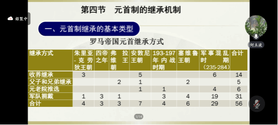 接着在第三部分,何教授讲述了元首的具体权力,包括立法权、行政与选举权、官员任命权、外交和军事权及司法权。紧随其后的第四部分中,针对大家都很感兴趣的元首继承机制,何教授总结出世袭和非世袭的四种基本方式:收养继承、父子和兄弟继承、元老院推选和军队拥戴。并在下面的环节中通过回顾帝国历史的方式详细说明了四种模式的差异与优劣,使得同学们对于元首制有了横向和纵向的深入思考。