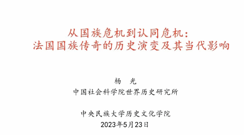 杨光老师在第一部分向我们介绍了选题缘起。国族传奇是法国史学史上一个重要的议题,它渗透在历史研究各个领域,对18世纪巴黎市政府乃至21世纪的法国政治都产生了深刻影响。杨光老师以近些年研究成果——“《民族的神话》和法国极右翼的政治—历史动员”为例,说明当下存在以国族传奇服务于现实的情况,这是一种历史意识对当下的渗透。