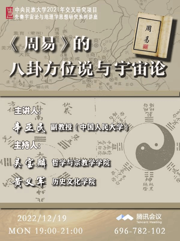 黄义军教授和哲学与宗教学学院吴宝麟老师邀请,中国人民大学国学院辛亚民副教授以腾讯会议的形式作了题为《〈周易〉的八卦方位说与宇宙论》的学术讲座。本次讲座为中央民族大学2021交叉研究项目“先秦宇宙论与地理学思想研究”系列讲座之三。讲座由吴宝麟、黄义军两位老师主持。来自全国40多所高校、研究机构300位学者、老师和同学参加了本次讲座。