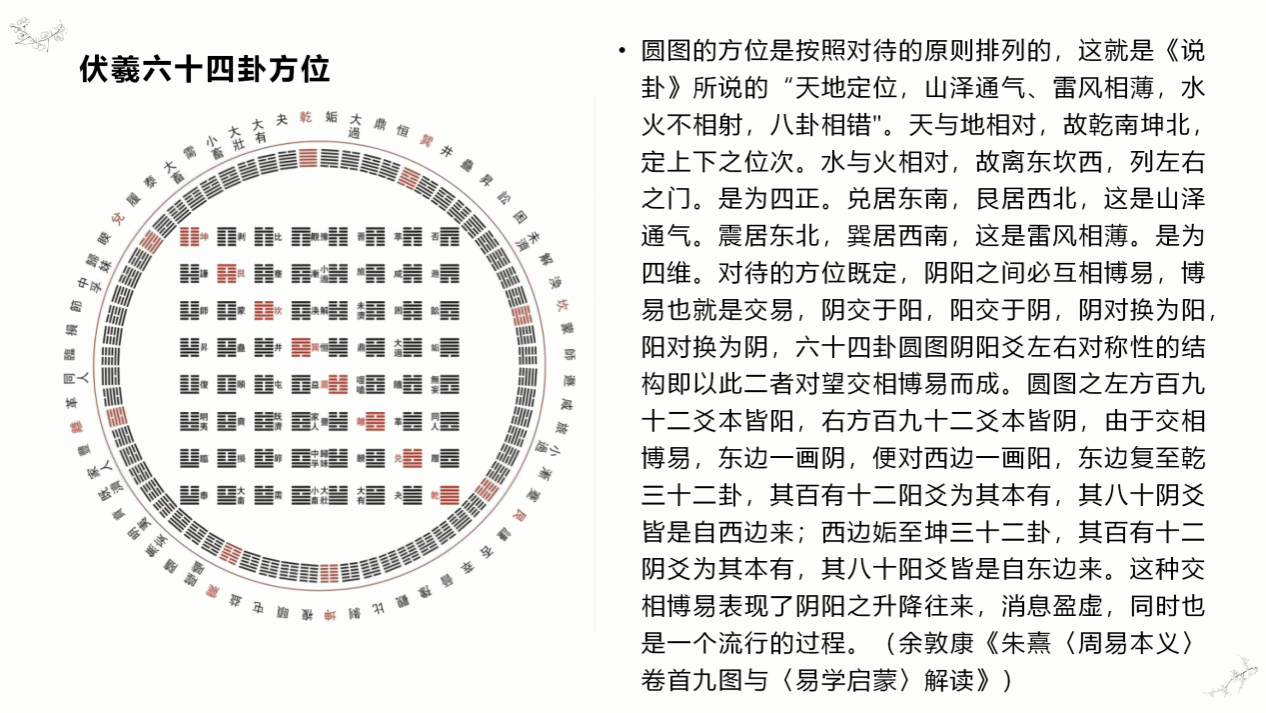讲座从导读《说卦传》文本“天地定位”章开始,疏理了先天卦位的源流。辛老师指出,这一章原本是讲述代表八种基本自然物揭示的四对矛盾对立情形,并没有表达方位的思想内容和次序问题。将八卦与八方结合起来的是宋人邵雍和朱熹的创造。邵雍在其“先天易学”的基础上对“天地定位”一段文字做了创造性的诠释,并以图式的形式加以呈现;朱熹继承这一学说,在其《周易本义》《易学启蒙》中,对邵雍的“伏羲先天八卦”主旨及图式加以进一步解释,明确了这一宇宙论模型。