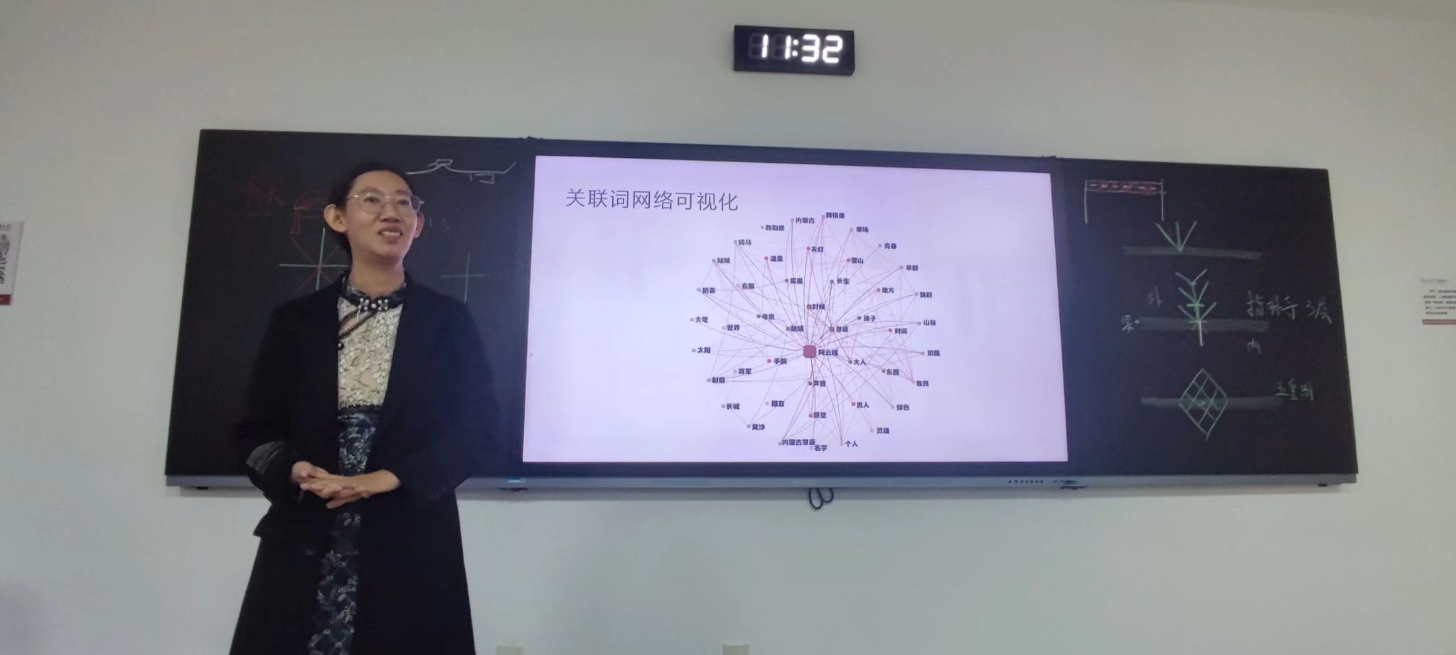 随后,讲座特邀嘉宾——包头师范学院副教授、包头师范学院文学院副院长贾舒登台演讲。讲座主要分为三个部分:“数智时代”的概念,“数智时代”的研究思路与工具、“数智时代”的研究反思。