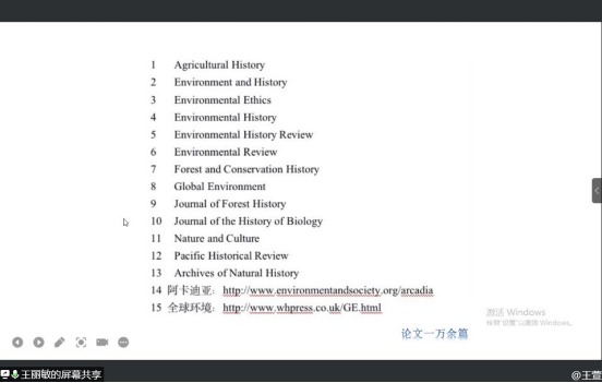 首先,王老师说明了环境史数据库建设的由来。该数据库,由清华大学历史系梅雪芹教授主持、设计和策划,旨在借助数据技术,整合基本数据,促进信息共享,利于学术研究。王老师阐发了环境史研究的两个核心问题:如何认识环境史研究的创新,及其对环境史研究总体创新的理解。王老师介绍了梅雪芹教授团队如何参照国内历史学科分类,结合环境史数据库的建库可行性,将环境史成果重新分类。具体可以划分为:新史学理论史学史、新通史、新区域国别史、新专门史、新专题史,分门别类并收集数据。她援引梅雪芹教授的观点,阐明了环境史数据库建设工作的意义:此项工作,可以为项目研究提供比较全面厚实的文献基础,为认识环境史学的创新提供一种指南,为思考研究如何创新提供一种参照。王老师还从历史题材、历史动力观、史学方法论、历史评价观、史学目的观、历史作用观六者的变革阐释了环境史创新的内涵。