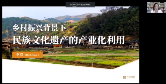 李霞博士首先介绍本次讲座的主题,即在乡村振兴国家战略背景下,民族文化遗产的产业化应用。讲座主要包括三方面内容:一、民族文化遗产在乡村振兴中的价值体现;二、5条实践中总结的民族村落文化遗产产业化利用路径;三、民族文化遗产的产业空间模型构想。