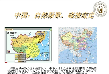 自成体系的地理环境,没有域外势力介入的情况下,统一多民族国家中国能在这一农耕、游牧、渔猎等兼有的自称体系的“地理单元”中逐步实现着“自然凝聚”,总结为“自然凝聚,碰撞底定”。
