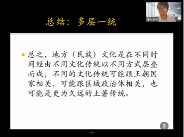 第三部分,总结:多层一统。杜老师对此前论述总结道:多层一统是理解中国文化多样性与统一性辩证关系的重要概念。“多层”指地方文化是由不同文化传统以不同方式层叠而成,它们来自不同中心;“多层”是指多层文化传统中存在的统合力量。纷杂的文化传统仪式中,与王朝国家联系紧密的宗教仪式占有优势,但王朝国家的传统控制作为法力来源,不干涉其他仪式传统运作,只负责法力传递与身份认证。杜老师表明其研究成果期望与美国人类学家华琛神明“标准化”理论作对话,从内容和形式两分视角论证中国文化的多样与统一不是适用于中国西南地区,应该将区域文化看作一个构建过程,即所谓多层。