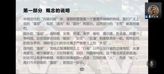 04:讲座的第四部分为“藩部的性质”。陈肖寒博士在本部分具体讲解了藩部在地方治理和对外关系等方面发挥的作用,厘清了清朝中央政府与藩部之间的关系。