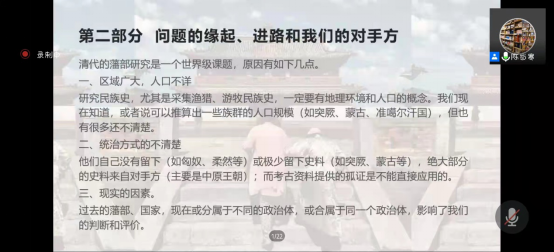 02:讲座的第二部分为“问题的缘起、进路和我们的对手方”。陈肖寒博士在该部分具体解释了“清代藩部研究”为何是一个世界级课题,说明了藩部问题对于民族史研究的重要意义以及其与近代中国边疆、民族问题的密切联系。