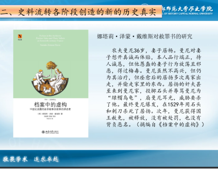 第二部分:史料流转各个阶段创造的新的历史真实,姚老师在这一部分中列举不同事例,重点考察史料流转中所呈现出的自身特点。首先在创造阶段,姚老师从史料学的角度入手,以娜塔莉·泽蒙·戴维斯《档案中的虚构》中对赦罪书写作的研究为例,提出,创作者与时代环境以性别、阶级、权利为纽带形成密切互动,构成全新的历史真实。
