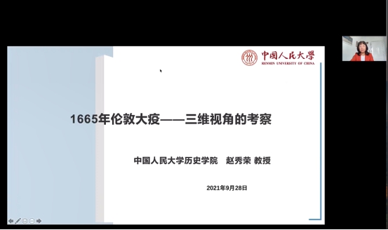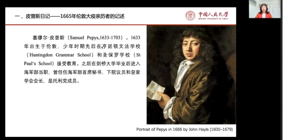 接下来,赵秀荣教授便重点以1665年伦敦大疫为切入点,为大家展开了丰富的讲座内容。本次讲座主要分为四个部分,第一部分便是“皮普斯日记——1665年伦敦大疫亲历者的记述”。在这一部分中,赵教授先讲述了皮普斯本人的生平,用其日记中的具体内容来分析伦敦大疫的真实情况和政府对策。此外,赵教授格外强调了日记作为一手史料,有极高的参考价值,同时其可信性也由于日记的目的并不在于宣传和报道而蕴含着普通人的同理心。因此,日记向我们展现了更真实的政府政策、人民声音和普通人的内心情感。